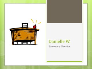 Danielle W. works at Menards and is the youngest sibling. Her favorite season is summer and she has a phobia of cotton balls that runs in her family. She had meningitis as a baby and has visited the emergency room several times as a child. She grew up on a farm and has met President Obama. Her hobbies include playing softball, watching baseball, boating, and spending time with her cousins. Her professional goals are to be an elementary school teacher, work in a successful school district, teach 4th grade, and assist with coaching volleyball. In 10 years, she wants to be teaching elementary students in a small Minnesota school district, living rurally and married with a child. She values