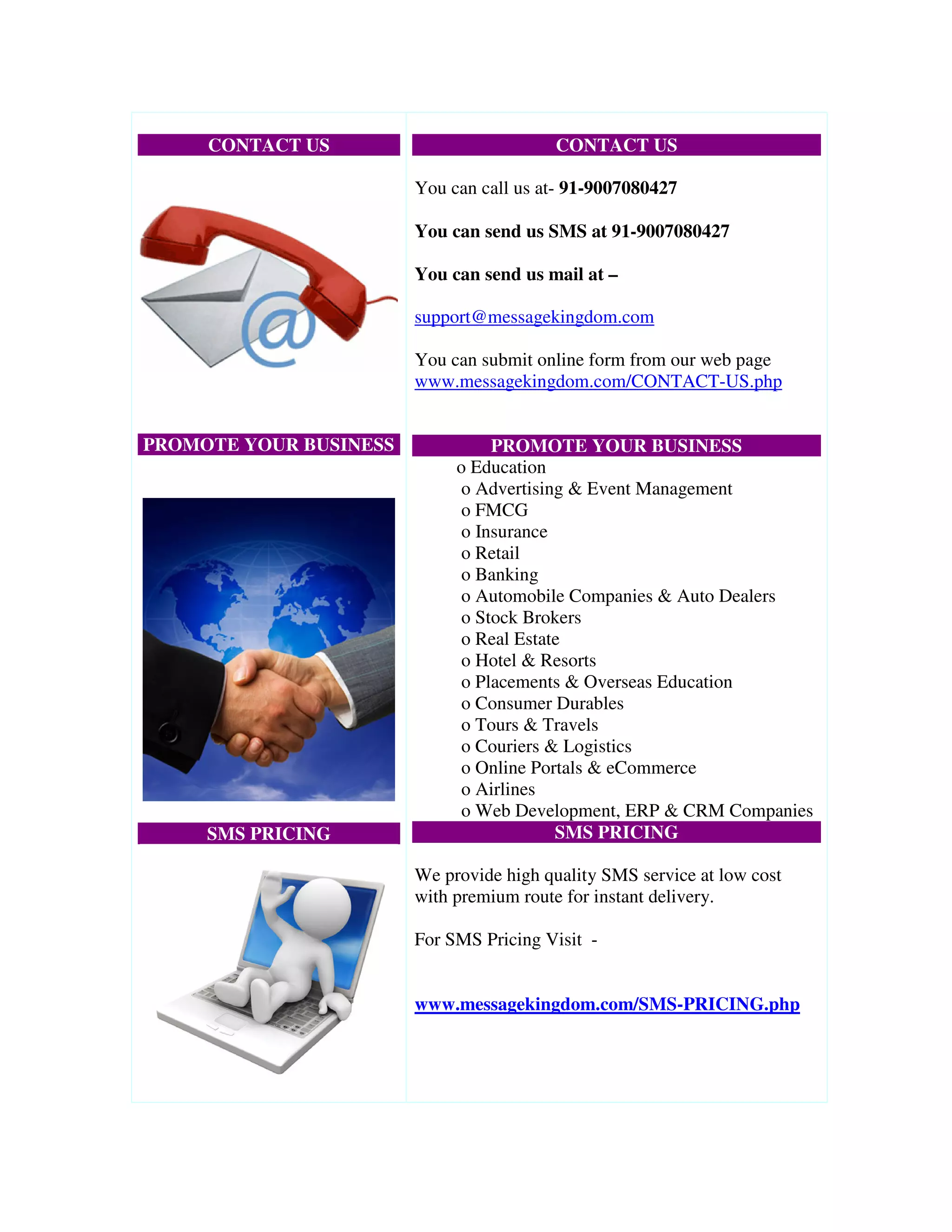 Message Kingdom is a bulk SMS service that allows users to send a large number of SMS messages from their computer through a web-based interface. It provides an affordable communication solution for businesses to promote themselves and market their products. New users can register, get login credentials via SMS, and begin sending messages immediately by composing, selecting recipients, and clicking send.
