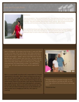 The document describes the author's parents, John and Gay Gail Welsh. They have been married for over 40 years after meeting as teenagers and initially disliking each other. They have five children together and several grandchildren. The author provides details about each parent's career, personality, hobbies and close relationship with their family.
