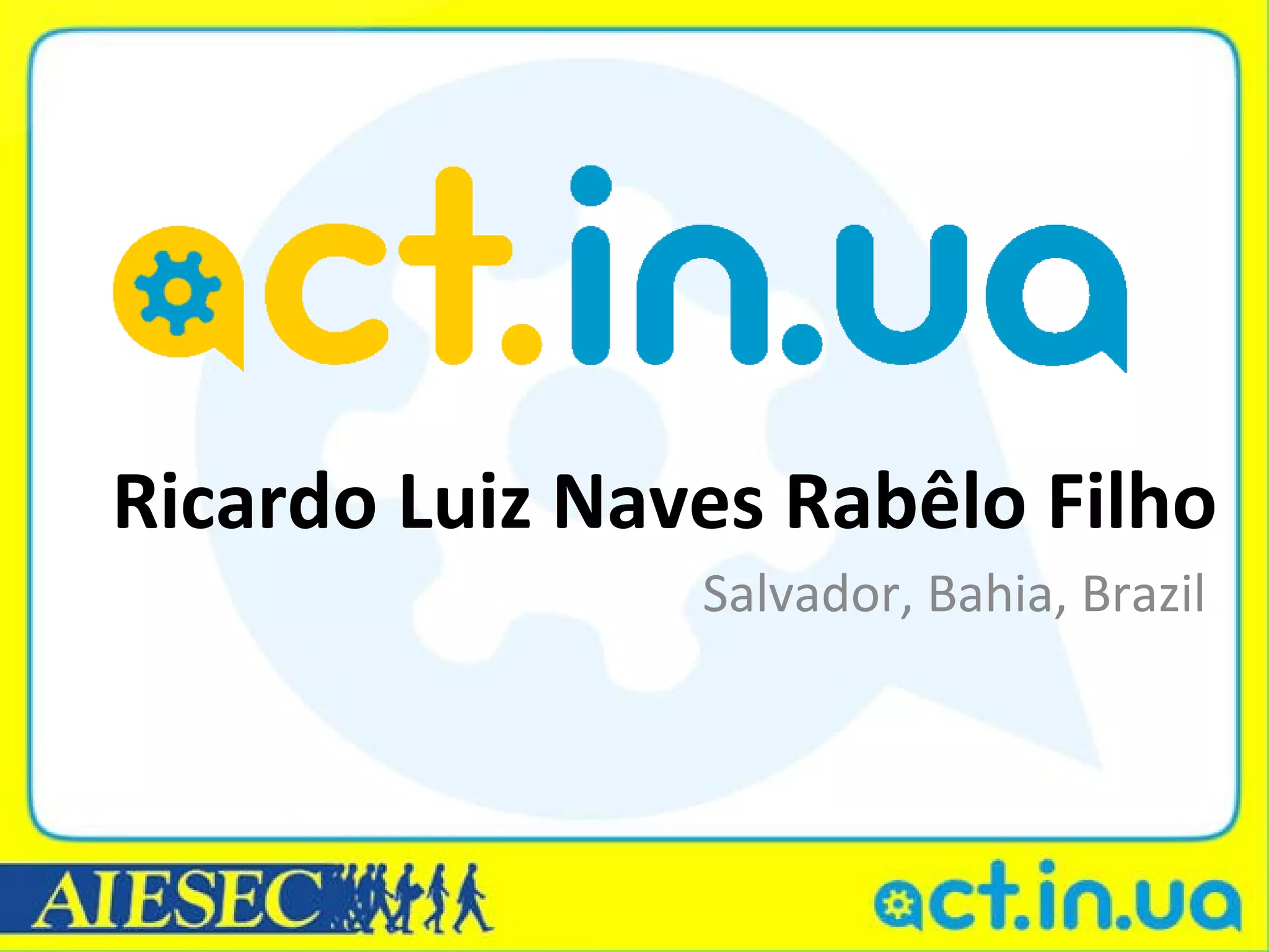 Ricardo Luiz Naves Rabêlo Filho is presenting information about himself, Brazil, the state of Bahia, and the city of Salvador, where he is from. He provides details about his background, education, interests, and work experience. He then gives an overview of Brazil's position globally, its national symbols and political system. Specific data is shared about Brazil's population, area, languages and major cities. The presentation concludes with sections about Bahia, Salvador, and AIESEC Salvador, the international youth organization Ricardo is involved with.