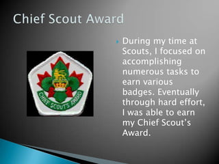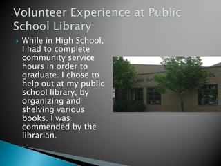 The document discusses the author's work experience and volunteer activities. Through their time in Scouts and high school community service, they earned various awards and commendations for their work organizing libraries and databases. Their managers at the Ministry of Government Services and CIBC were impressed with their results monitoring for malicious content and building databases. The author also volunteers with Autism Ontario to help their brother who has autism.