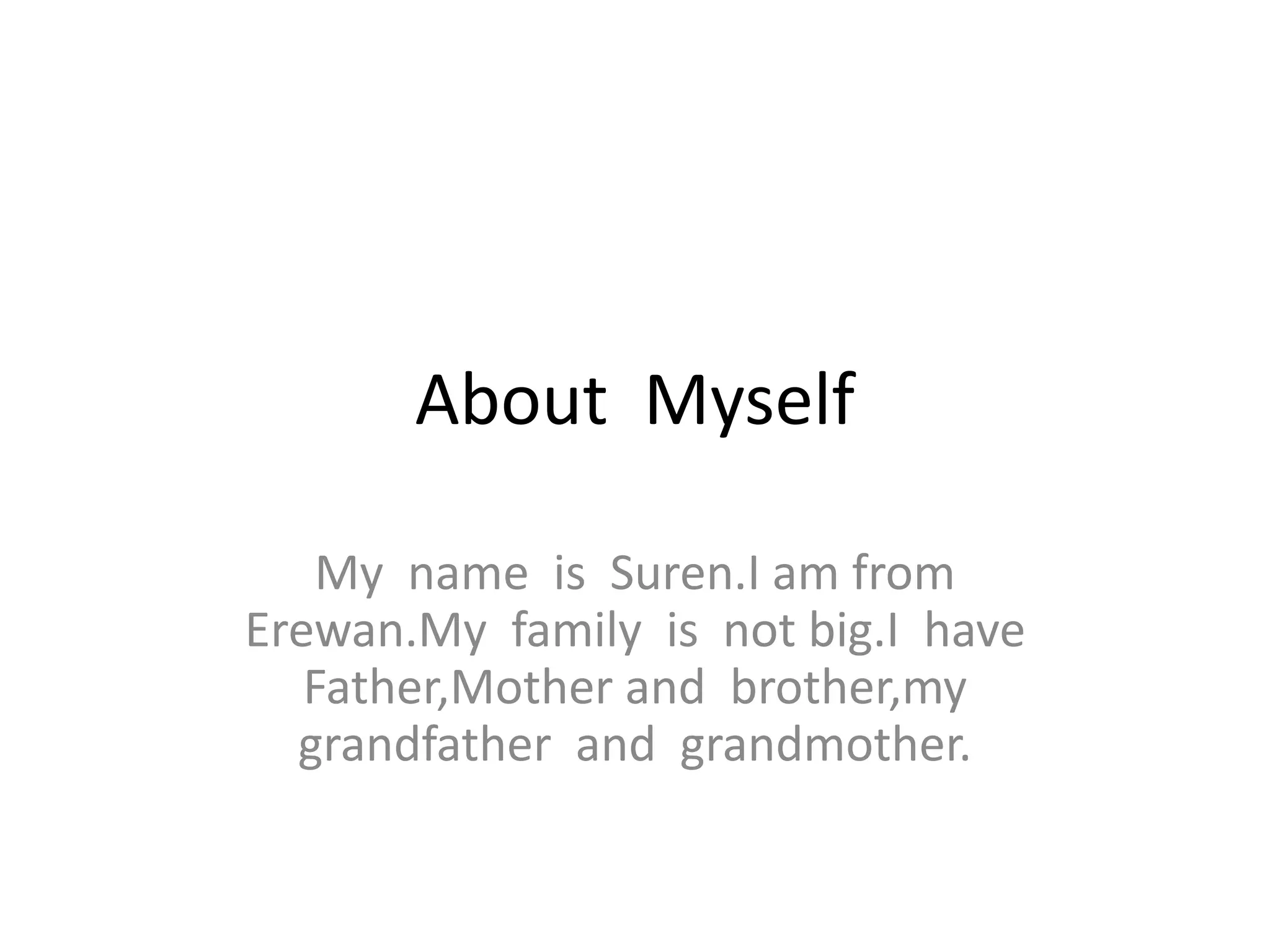 Suren is from Erewan and lives with his father Ishxan, who is an engineer, mother Mariam, who is a doctor, younger brother Aren who is 1 year old, grandfather, and grandmother. Suren's typical day involves waking up at 8am, washing and getting dressed, eating breakfast, attending school until 3pm, resting and playing on the computer or doing lessons in the afternoon, playing with family and on computer games in the evening, and going to bed at 10pm. He has a dog named Jeko that provides entertainment.