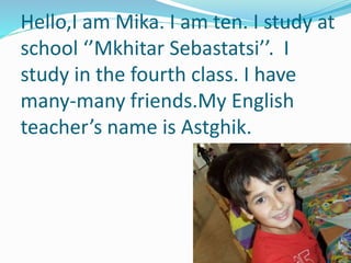 Mika is a 10-year-old student at Mkhitar Sebastatsi school in the fourth class who has many friends. Their favorite game is tennis, although they are not very good at it. Mika has an older brother named Samvel who is also 10, has green eyes and brown hair, likes cartoons and playing with Mika. During the summer, Mika and their family go to the sea with relatives.