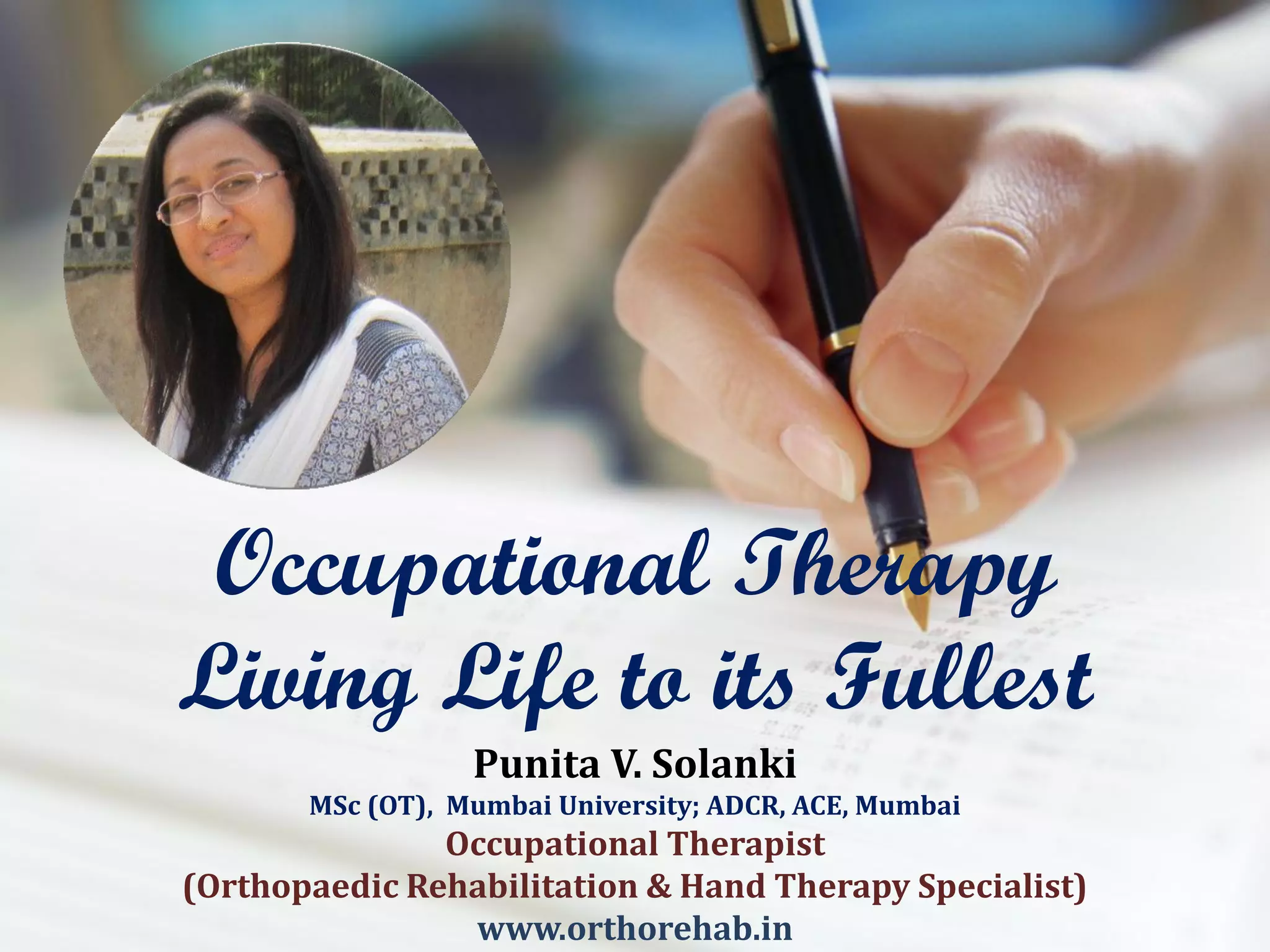 Occupational therapy is a client-centered healthcare profession that promotes health and well-being through occupation-based therapy. The primary goal of occupational therapy is to enable people with impairments to participate in all activities of daily life and return to life roles in a timely manner. Occupational therapists work with all age groups and with a wide range of physical and psychosocial impairments in settings like hospitals, clinics, nursing homes, schools, and private enterprises. Occupational therapists assess, plan treatment, provide interventions, and work as part of a team. Interventions may include adjunctive techniques, enabling skills, purposeful activities, and occupation-based approaches to support a return to home and community.