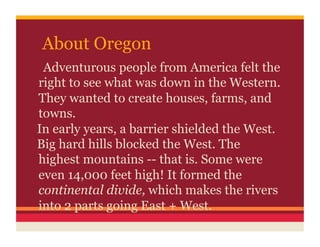 The Oregon Territory originally included the modern states of Idaho, Washington, and Oregon. It was bounded by the Pacific Ocean to the west, California to the south, and the Rocky Mountains to the east. In the early 19th century, adventurous Americans began settling in the Oregon Territory to establish homes, farms, and towns, despite barriers like mountain ranges blocking passage to the western lands. The United States officially gained control of the Oregon Territory through a treaty with Britain in 1846.
