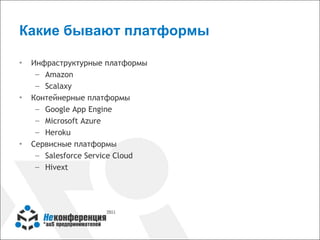 Документ обсуждает перспективность облачных платформ для SaaS-предпринимателей, включая различные типы платформ, такие как инфраструктурные, контейнерные и сервисные. Основные преимущества включают оптимизацию затрат на разработку и инфраструктуру, быстроту валидации идей и использование ресурсов по мере необходимости. Однако также перечислены недостатки, такие как ограничения по технологии и неясность местонахождения данных.
