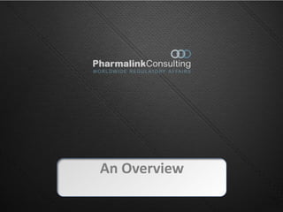 This document provides an overview of Pharmalink, a regulatory affairs consulting firm. It discusses Pharmalink's capabilities and experience, including that it has over 155 staff and works with 18 of the top 20 healthcare companies. The document also presents 4 case studies of large regulatory projects Pharmalink has successfully completed for major pharmaceutical clients. These involved global compliance, product licensing, and mergers/acquisitions work. Finally, it notes Pharmalink's global regulatory expertise and additional translation capabilities.