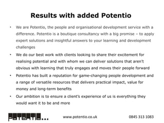 Potentio is a boutique consultancy that provides people and organizational development services through comprehensive training programs, detailed projects, partnerships, and coaching. They have experience working with clients in various industries like legal, retail, and public sector. Some example clients highlighted are Mills & Reeve, Muji, and Jongleurs. Potentio is led by three experienced individuals and takes a collaborative approach to developing customized solutions that engage employees and provide tangible business impacts.
