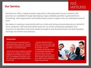 Red Ventures offers recruitment services focused on attracting talent for clients through developing a large candidate pool generated from networking, referrals, and headhunting. They work in partnership with clients and have placed candidates in a variety of roles. Testimonials praise their thorough understanding of clients' businesses and consistent results. They also operate a graduate recruitment academy that sources, assesses, trains, and develops entry-level recruitment talent through a comprehensive assessment and training program.