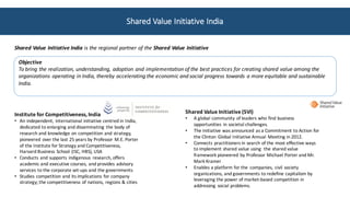 Shared Value Initiative India is a non-profit organization focused on promoting responsible business practices that create economic and social value. It connects corporate leaders, civil society, and government to redefine capitalism by addressing societal challenges through market-based solutions. The initiative organizes workshops, summits, and awards like the Porter Prize to recognize companies making a positive impact on society.