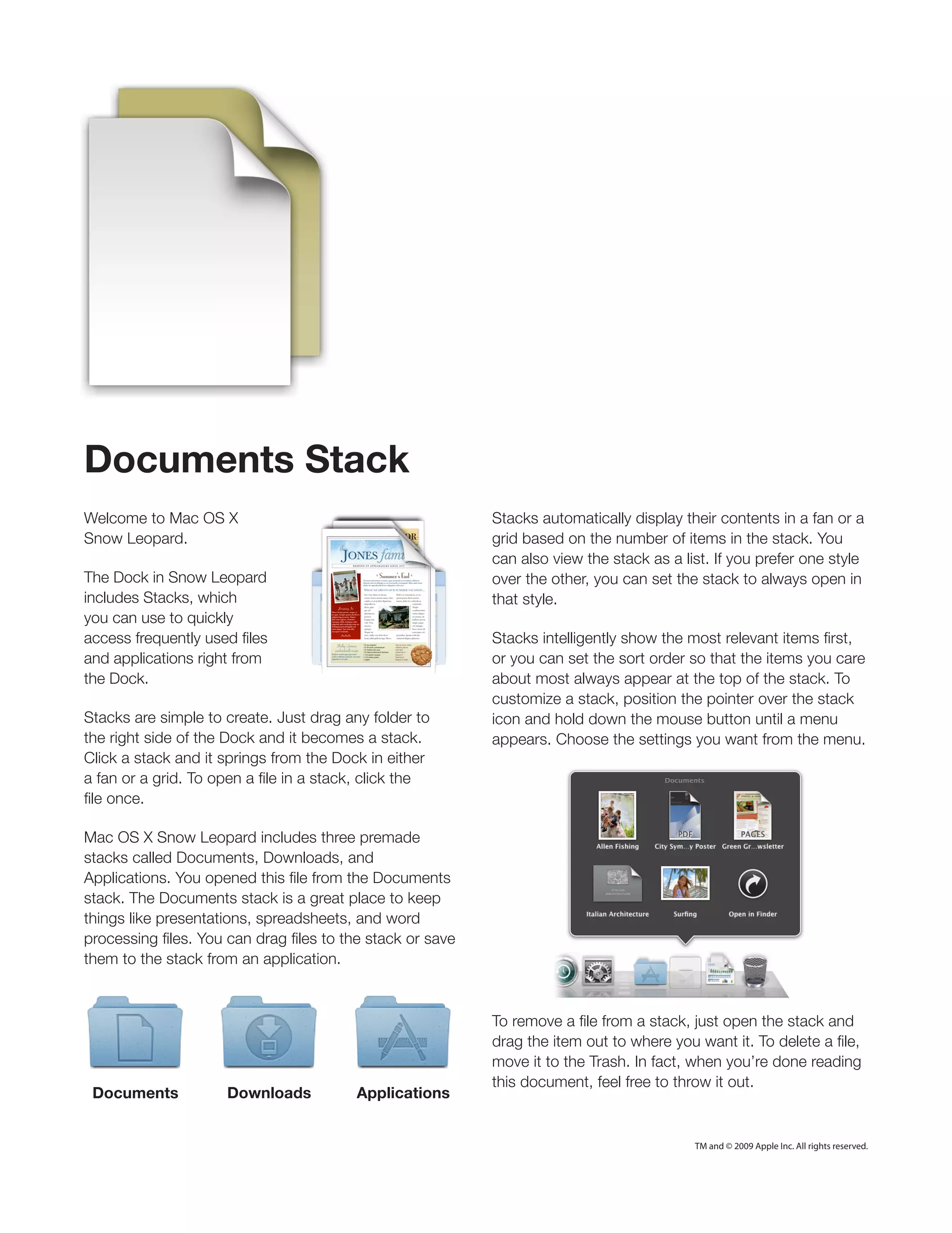 Stacks allow you to organize and access files, folders, and applications directly from the Dock in Mac OS X Snow Leopard. Dragging a folder to the right side of the Dock creates a stack. The Documents stack is pre-made to store presentations, spreadsheets, and other documents. Clicking a stack fans out or grids its contents for easy access.
