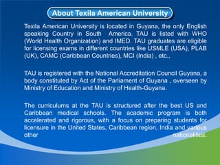 Texila American University is located in Guyana and offers both campus-based and online medical, dental, nursing, and psychology programs. It has affiliations with hospitals for clinical training opportunities and is recognized by several international accrediting bodies. The university aims to provide high-quality health sciences education and help students qualify for licensing exams around the world.