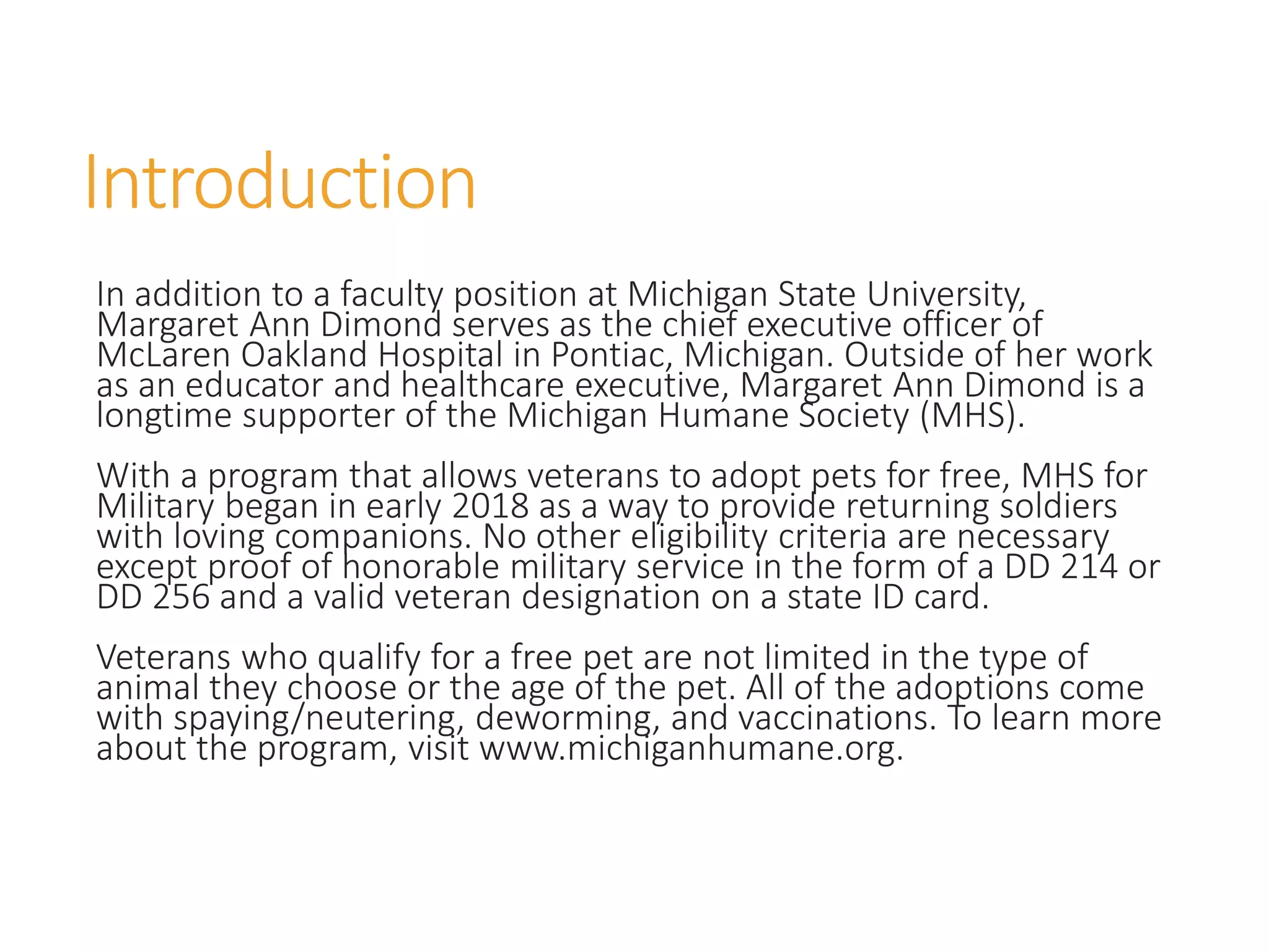 The document outlines the MHS for Military program, which allows veterans to adopt pets for free, initiated by Margaret Ann Dimond in 2018. Eligibility requires proof of honorable military service, and veterans can choose any type or age of pet, which come fully vaccinated and spayed/neutered. More information is available on the Michigan Humane Society website.