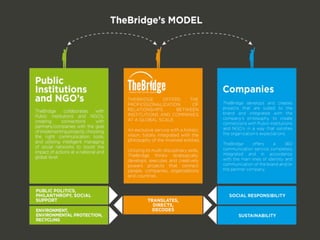 This document describes a company called The Bridge Global that works on social innovation projects using digital communication. It connects people, companies, and governments to promote social responsibility and reduce inequality between groups. The company identifies projects of interest to society that promote cooperation between different parties. It also works to achieve the UN's Millennium Development Goals by 2015 by mobilizing different players like businesses and encouraging partnerships for economic and social impact.