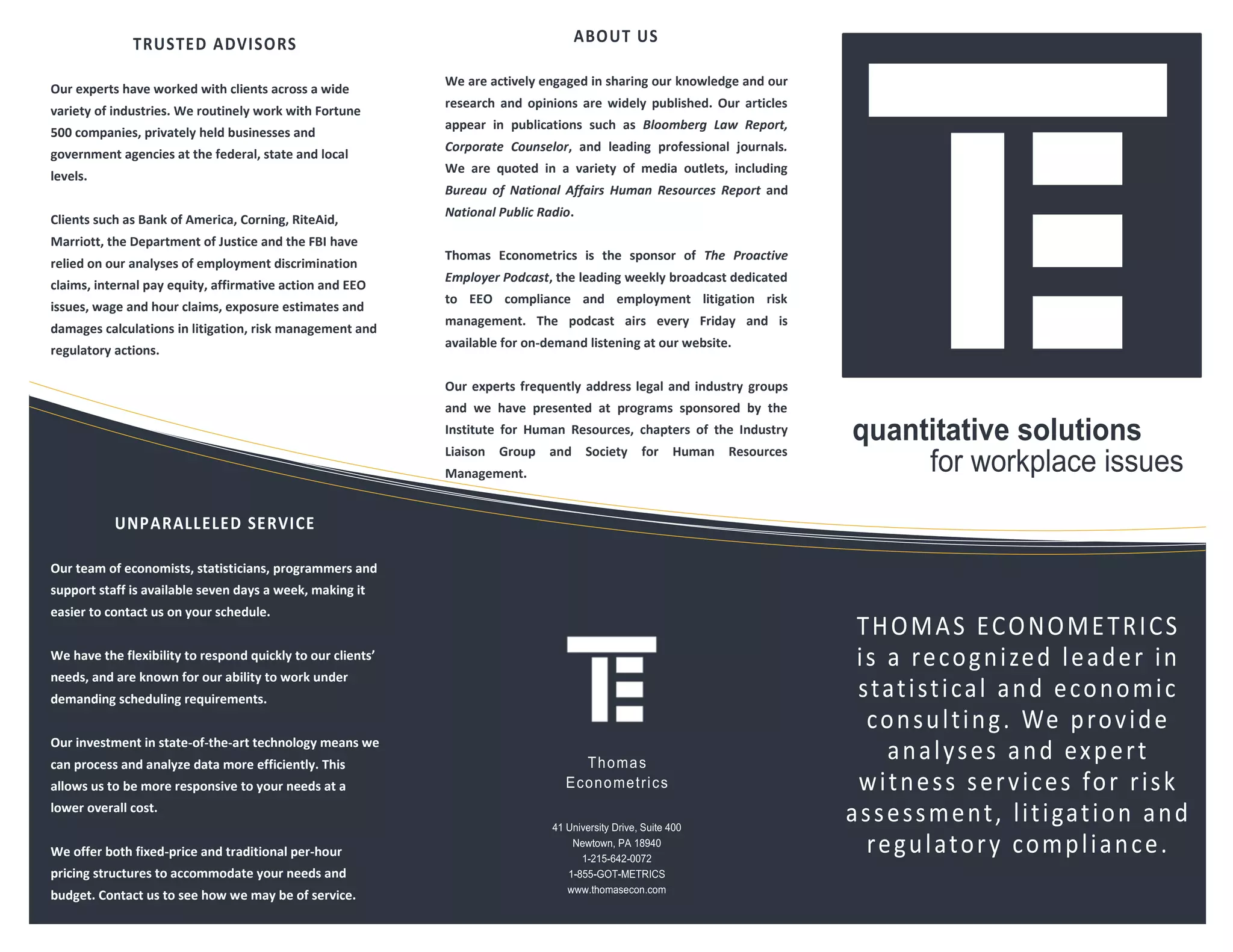 This document summarizes the services provided by Thomas Econometrics, an expert consulting firm that specializes in economic and statistical analysis for employment litigation, regulatory investigations, and risk management strategies. They have expertise in areas such as employment discrimination, compensation studies, wage and hour law, and reduction in force planning. Their team of experts can collect and analyze data, perform statistical analyses, calculate damages, and provide expert testimony. They work with large companies, government agencies, and legal groups to analyze issues such as pay equity, hiring/promotion bias, and compliance with anti-discrimination statutes.