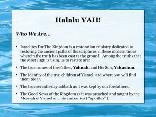 Israelites For The Kingdom is a restoration ministry that aims to restore ancient biblical truths such as the true names of God, the identity of the Israelites, the observance of the seventh-day Sabbath, and the message of the Kingdom as taught by Yeshua and his disciples. The ministry provides over 200 audio lessons on topics like discipleship and the end times on their website. They also host a blog that addresses questions about the identity of Israelites today and podcast live Torah discussions and lessons weekly.