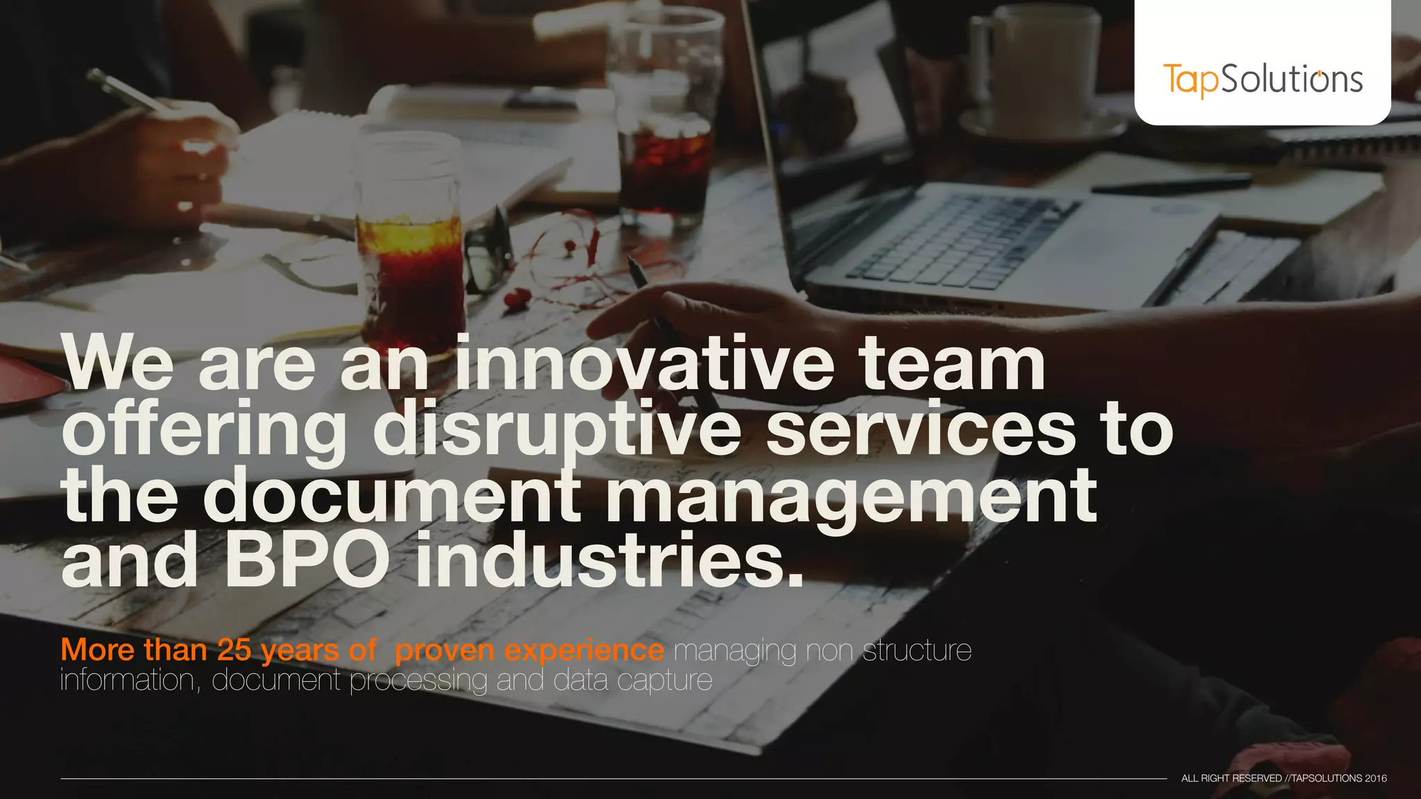 TAP Solutions provides innovative document management and BPO services with over 25 years of experience in data capture and processing. Their system boasts significant cost reduction and high-quality data transcription, with capabilities for processing over 6000 fields per minute while maintaining strict security standards. The company emphasizes collaboration with partners to create a sustainable ecosystem that also supports vulnerable communities.