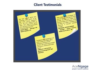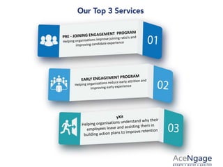 AceNgage is an HR intelligence company that provides employee engagement and retention services to organizations. It was established in 2007 and currently works with leading companies in various industries. AceNgage uses insightful analytics to help managers take evidence-based actions to improve employee engagement and retention, and also monitors the implementation of these actions. It has a staff of 42 employees including behavioral psychologists, analysts, and trainers.