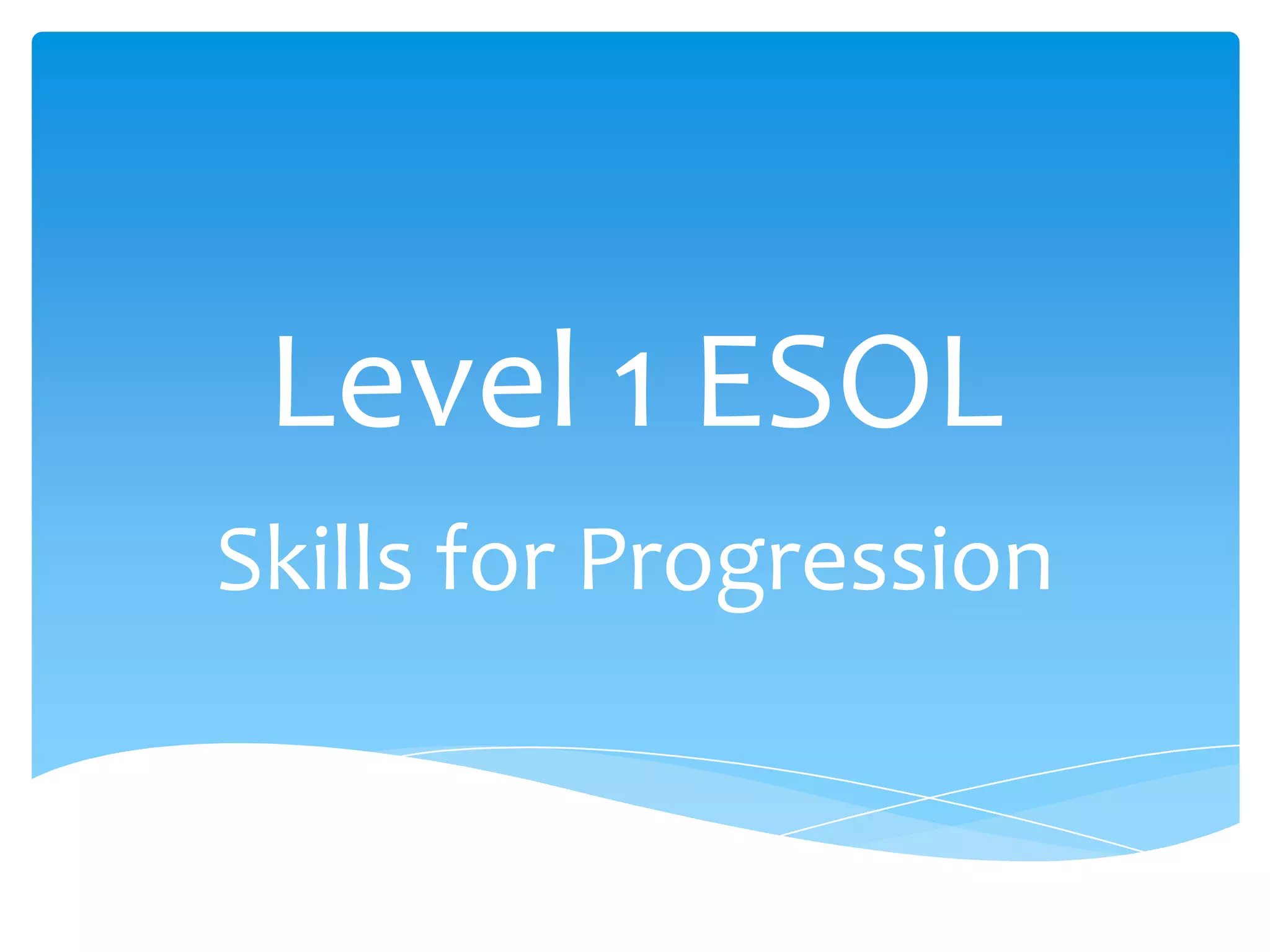 This document summarizes the Level 1 ESOL Skills for Progression qualification, which is awarded by the National Open College Network. The qualification has three parts and is assessed through credits earned for successfully completing tasks, written work, or speaking activities. Learners can progress from the Award to the Certificate to the Diploma by completing all 14 units and attending the full course. After completing Level 1, learners can progress to Level 1, 2, or 3 vocational or academic courses depending on their skills and experience.