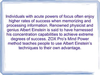 ZOX Pro's Mind Power method teaches techniques used by Albert Einstein to enhance focus and concentration, allowing users to better memorize and process information. After studying Mind Power, users will improve their attention, productivity, and understanding while also learning to reduce distraction. Mind Power provides a free sneak peek at ZOX Pro's Brain Enhancing Technology product, which further shows individuals how to control their lives by reducing stress and practicing decision-making skills to become experts in their fields and experience success.