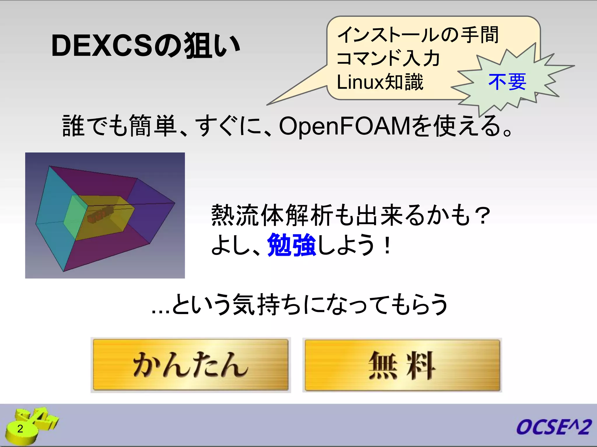 DEXCSの狙い 誰でも簡単、すぐに、OpenFOAMを使える。 熱流体解析も出来るかも? よし、勉強しよう! ...という気持ちになってもらう インストールの手間 コマンド入力 Linux知識 不要 2