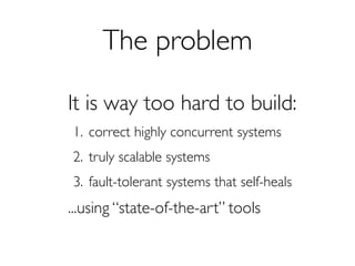 The document introduces Akka, a toolkit for building concurrent, scalable, and fault-tolerant systems using a unified programming model. It discusses the concept of actors, remote actors, deployment configurations, and fault tolerance strategies, highlighting their application in various fields like finance and gaming. Upcoming features for Akka include publish/subscribe systems, compute grids, and improved fault tolerance mechanisms.