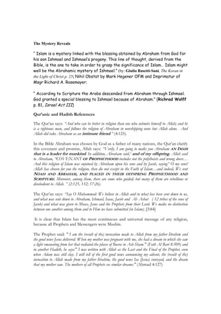 This document outlines the genealogical lineage of Abraham through his two sons Ishmael and Isaac. It discusses the covenant God made with Abraham to make Ishmael a great nation and that twelve princes would come from him. The document provides biblical references that support Islam being the fulfillment of this promised blessing to Ishmael and his progeny. It argues that Islam has the most continuous message from God as all prophets, including Abraham, were Muslim according to the teachings of Islam.