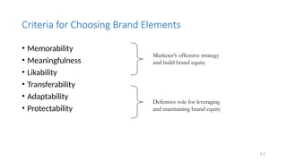 The document outlines the criteria for selecting brand elements, highlighting the importance of memorability, meaningfulness, likability, transferability, adaptability, and protectability in building brand equity. It discusses various tactics for brand elements such as brand names, logos, characters, and packaging, and emphasizes the significance of integrating marketing strategies to strengthen brand associations. It also addresses modern marketing approaches like one-to-one marketing, permission marketing, and experiential marketing as key strategies for enhancing brand management.