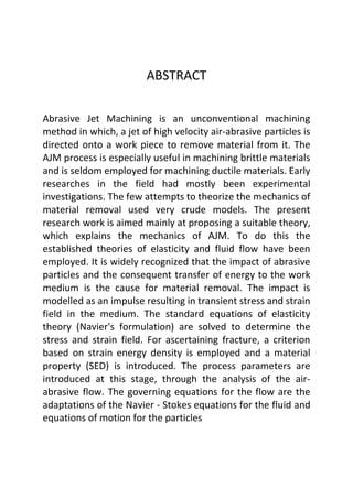 The document summarizes abrasive jet machining (AJM), an unconventional machining process. In AJM, a high velocity jet of abrasive particles carried by compressed air or gas is directed at a workpiece to remove material. Key aspects of AJM include the gas propulsion system, abrasive feeder, machining chamber, AJM nozzle, and abrasives used. AJM is useful for machining brittle materials and provides better surface finish than conventional machining. The document outlines the various components and process of AJM.