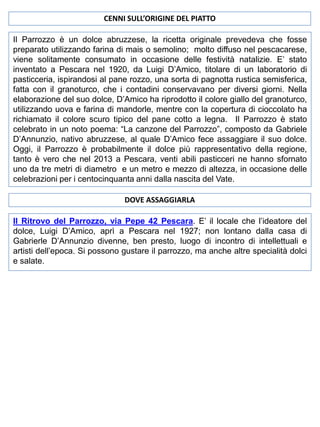 Il documento descrive la ricetta del parrozzo, un dolce tradizionale abruzzese, e il suo inventore Luigi D'Amico, evidenziando le origini e l'importanza culturale del piatto. Viene anche esaminata la gastronomia delle regioni Abruzzo e Molise, con un focus su ingredienti tipici, piatti locali e tradizioni alimentari. Infine, si parla delle attrazioni turistiche della regione, tra cui parchi naturali, borghi storici e specialità culinarie, sottolineando l'importanza della sostenibilità e della promozione del turismo.