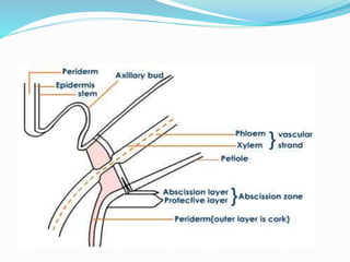 Abscission is the process by which plant organs such as leaves, flowers, and fruits become detached from the plant in a controlled manner. It occurs through the formation of an abscission zone, a layer of weak-walled cells located at the base of the petiole or other structure. Abscission is controlled by the plant hormones auxin and ethylene, with decreasing auxin and increasing ethylene levels initiating cell wall degradation in the abscission zone. This allows separation of plant organs through a combination of enzymatic breakdown and mechanical forces. Abscission aids in shedding organs no longer needed by the plant and occurs in response to environmental and developmental signals.