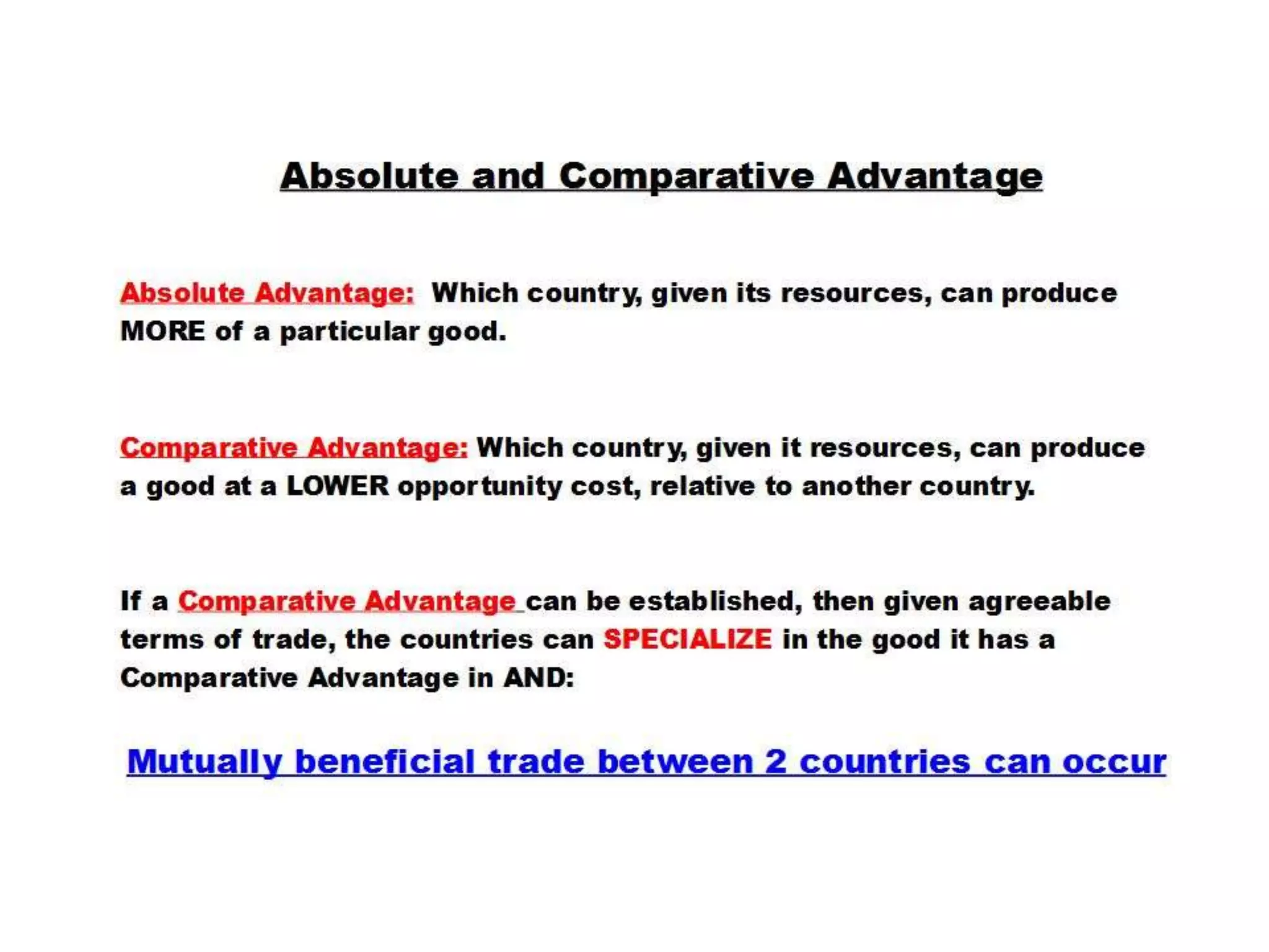 The document discusses absolute and comparative advantage between two countries, A and B, that produce cloth and wine. Country A can produce more wine but less cloth than Country B. Country B can produce more cloth but the same amount of wine as Country A. It is determined that Country B has a comparative advantage in cloth production since it has a lower opportunity cost than Country A. Country A has a comparative advantage in wine production as it has a lower opportunity cost than Country B. Therefore, both countries would benefit from specializing in what they have a comparative advantage in and trading - Country B should focus on cloth while Country A focuses on wine.