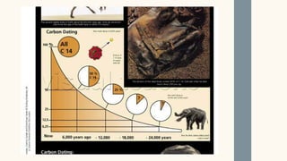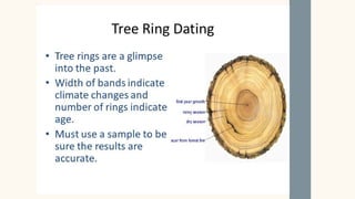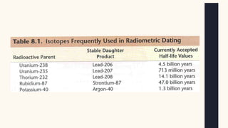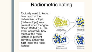 The document discusses the objectives and methods of relative and absolute dating used in geology to determine the age of stratified rocks. Relative dating arranges geological events sequentially, while absolute dating provides specific numerical ages through methods like radiometric dating. Key principles of relative dating are also outlined, including superposition and original horizontality.