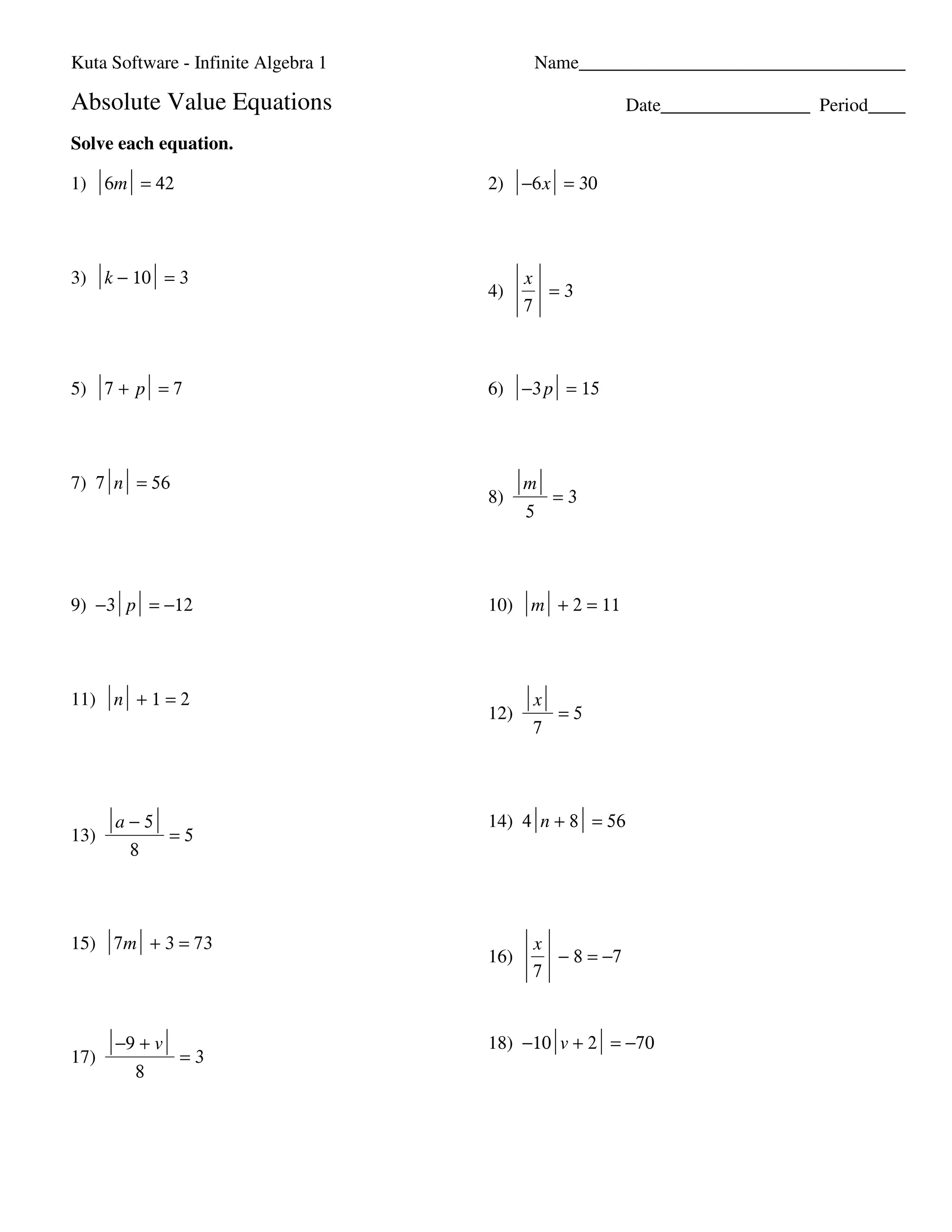 The document provides 18 absolute value equations to solve. It asks the reader to solve each equation and provides the equations one per line with blank space for the solutions. The equations include variables such as m, x, k, p, n, and v.