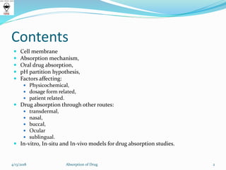 The document discusses drug absorption through various routes of administration like oral, transdermal, nasal, etc. It covers the cell membrane mechanisms involved in drug transport, including passive diffusion, active transport, carrier-mediated transport and endocytosis. Factors affecting drug absorption are categorized as pharmaceutical, dosage form related and patient related. Key physicochemical properties discussed are drug solubility, dissolution rate and theories of dissolution.