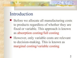 This document provides an overview of absorption costing and marginal costing. Absorption costing treats all manufacturing costs, including fixed costs, as product costs. Marginal costing treats only variable manufacturing costs as product costs and regards fixed costs as period costs. The document also discusses the treatment of fixed overheads, valuation of closing stock, and reported profit under each method. It then covers the concepts of break-even analysis including calculation of break-even point, target profit, margin of safety, and the impact of changes in cost and revenue components. The limitations of break-even analysis are also summarized.