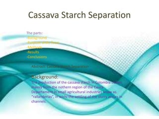 This document summarizes two studies. The first study evaluated the sedimentation process of cassava starch in rectangular channels used in Colombian agriculture. It found that the slurry concentration during operation was usually between 0.1-6% and that discrete particle settling predominated. Particles between 6.7-8.8um were discharged into local water bodies, causing environmental issues. The second study analyzed Spanish adolescents' sexual practices and protection methods depending on their age of sexual debut. It found that debut before 15 was associated with increased risk of infection, less condom use, and more sexual partners.