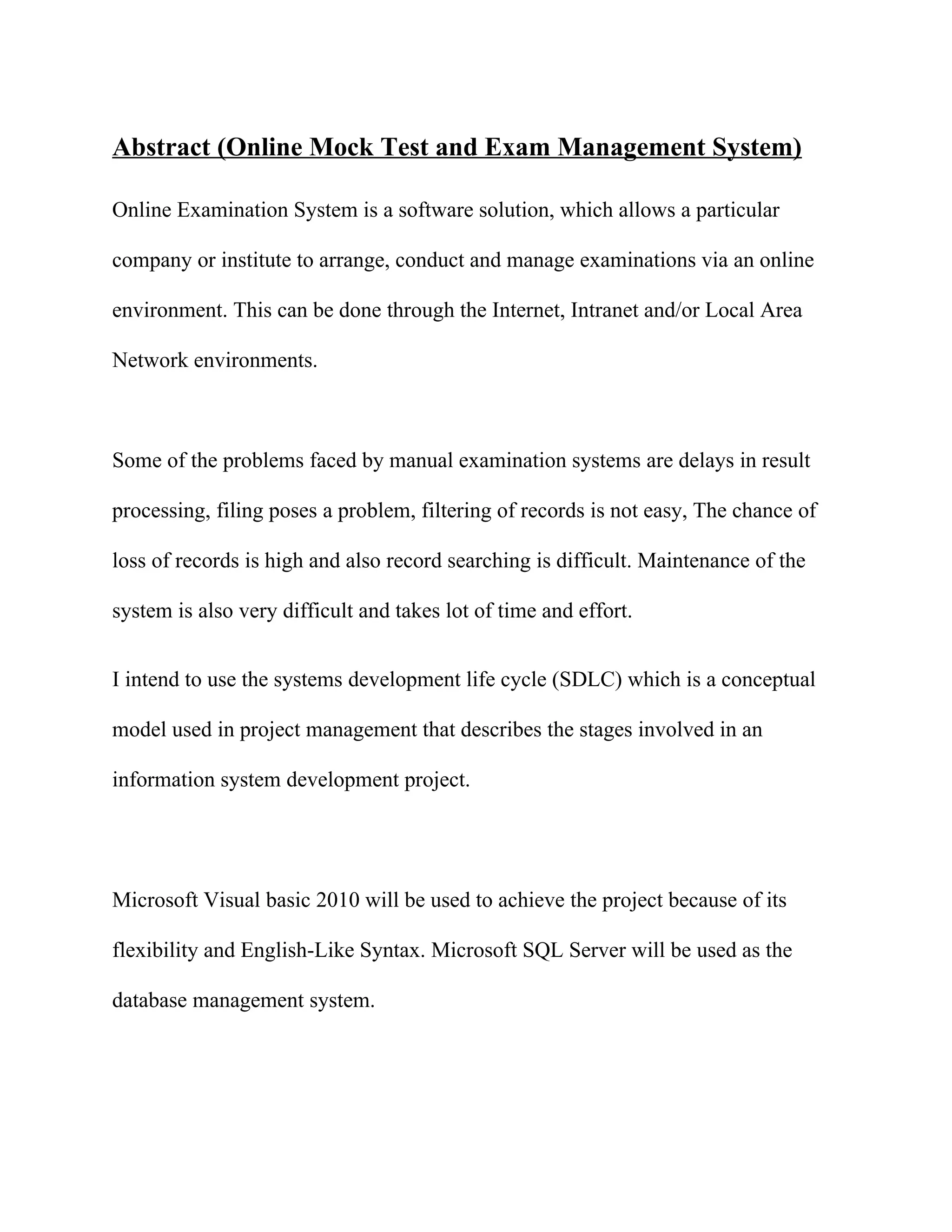 The document discusses the development of an online examination system as an alternative to a manual paper-based system. It outlines some of the drawbacks of the current manual system, such as delays in results, difficulty maintaining records, and proposes building a web-based online examination system using Visual Basic and SQL Server. The system would allow exams to be conducted remotely, graded automatically or manually, and results released faster without the costs associated with paper exams. It also reviews features of some existing online exam systems and justifies why developing a new system could reduce costs, efforts, and time compared to the current manual process.