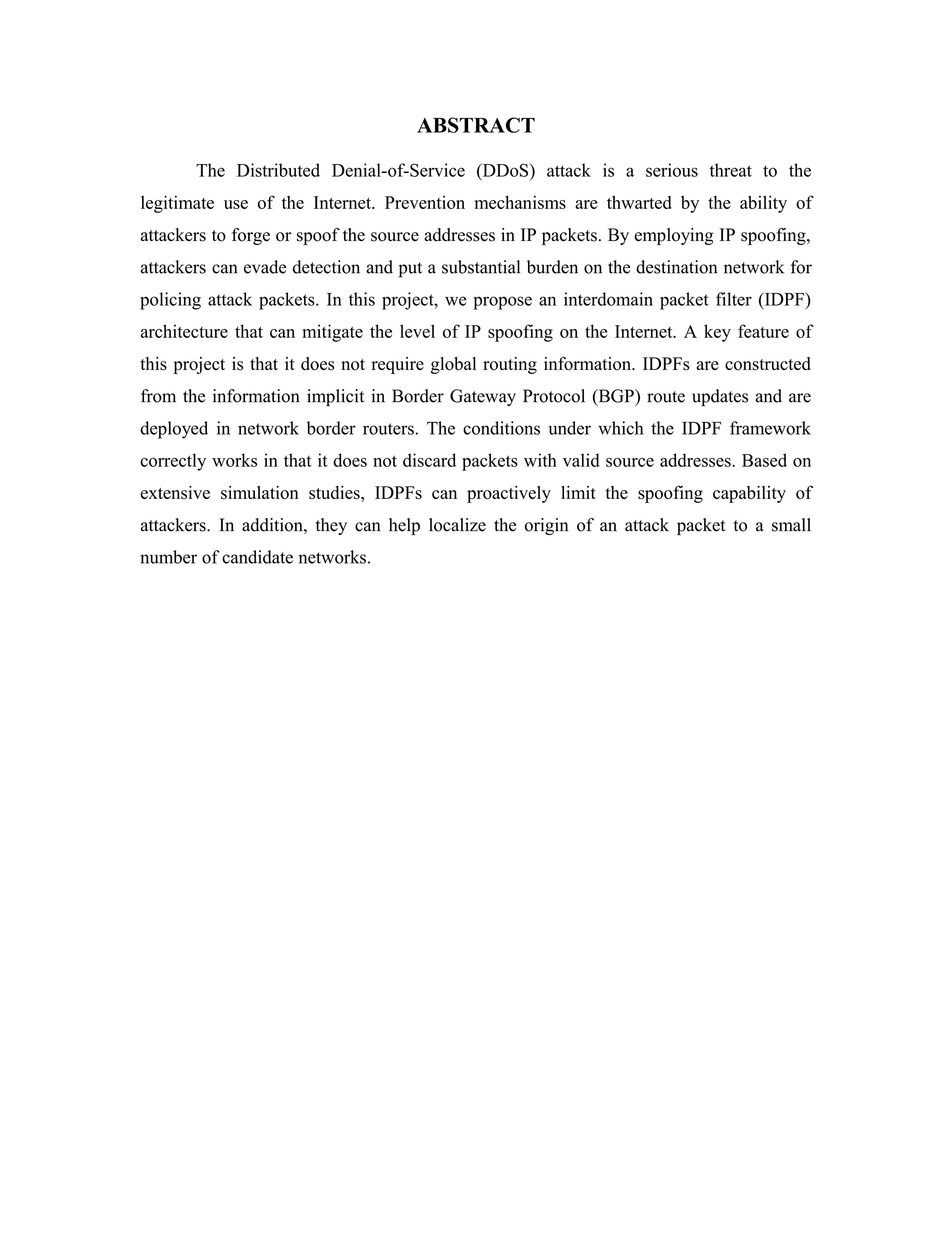 DDoS attacks are difficult to prevent because attackers can spoof IP addresses. This document proposes an interdomain packet filter (IDPF) architecture that can mitigate IP spoofing without requiring global routing information. The IDPFs are constructed from Border Gateway Protocol route updates and deployed in border routers. Simulation studies show IDPFs can limit spoofing by attackers and help localize the origin of attack packets to a small number of networks.