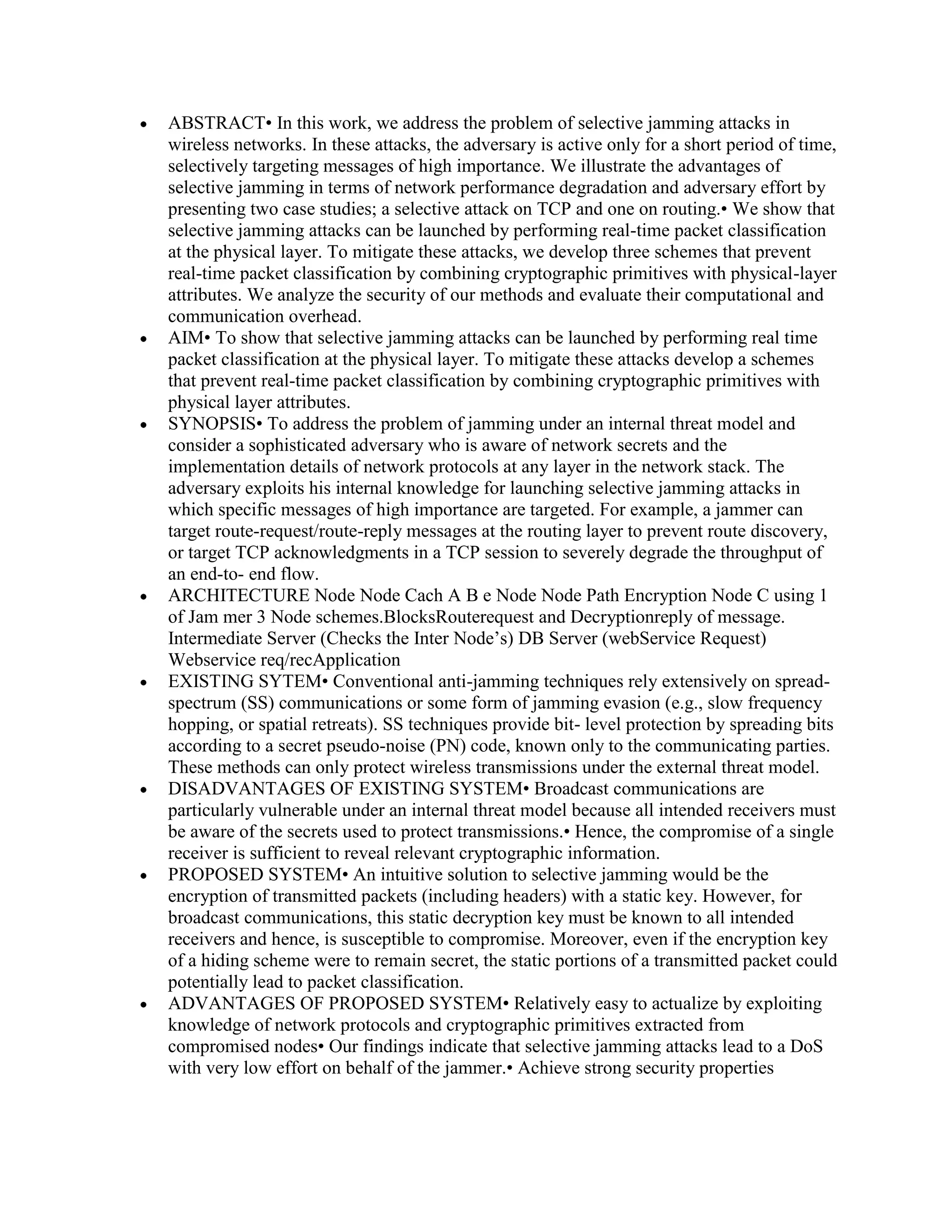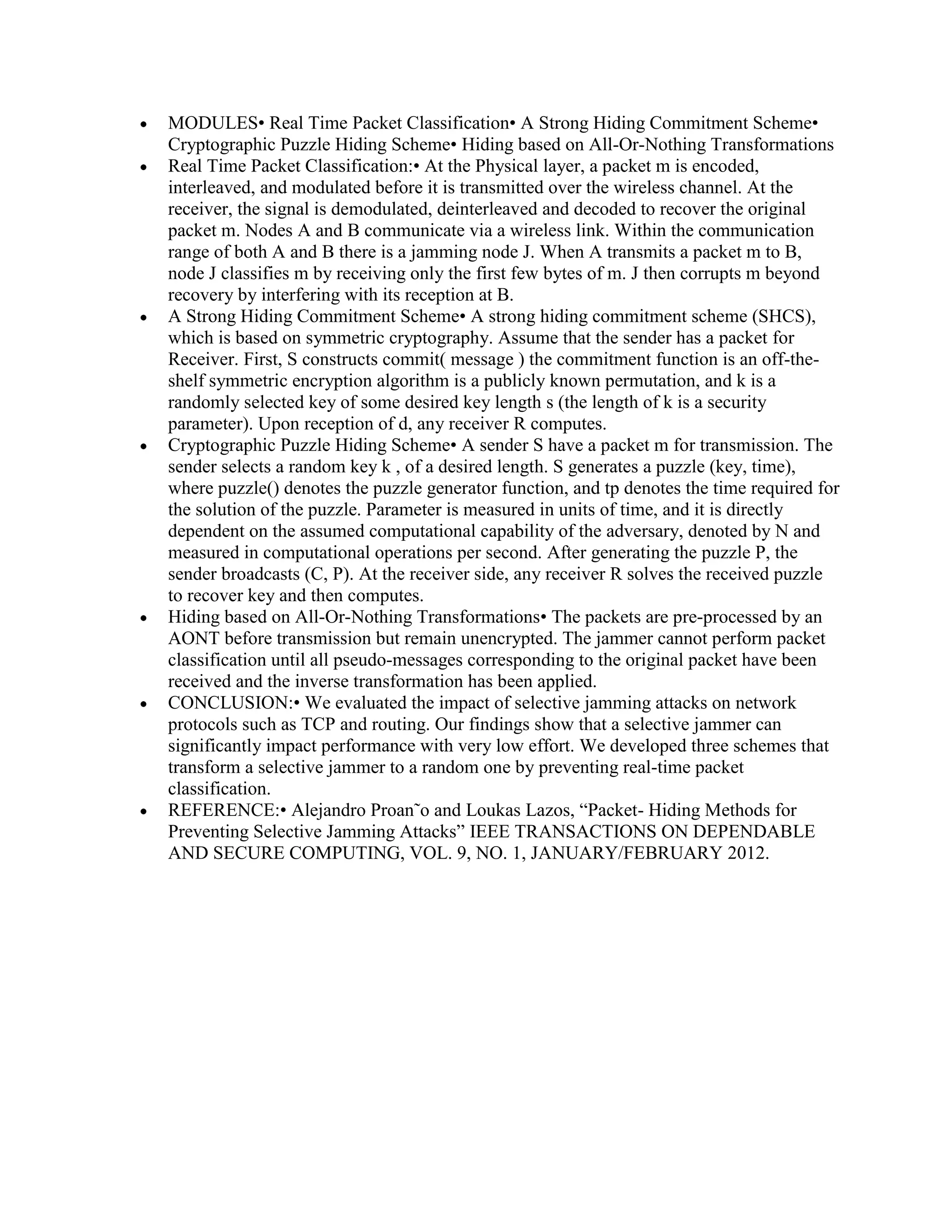 The document discusses selective jamming attacks in wireless networks where an adversary targets important messages. It presents three schemes to prevent real-time packet classification and mitigate these attacks: 1) A strong hiding commitment scheme that uses symmetric encryption to hide packet contents, 2) A cryptographic puzzle hiding scheme that requires solving a puzzle to recover encryption keys, 3) Hiding based on all-or-nothing transformations that pre-processes packets to prevent classification until all pseudo-messages are received. The schemes aim to transform selective jamming into random jamming and were evaluated to achieve strong security properties with low overhead.