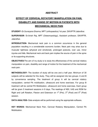 This study aims to evaluate the effectiveness of cervical rotatory manipulation for treating mechanical neck pain. A minimum of 30 subjects will be divided into two groups - group A will receive cervical rotatory manipulation along with other treatments, while group B will only receive other treatments. Both groups will receive 5 treatment sessions over 8 days. Pain, disability, and range of motion measurements will be taken before, during, and after treatment to analyze the impact of cervical rotatory manipulation for mechanical neck pain.