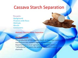 The document summarizes a study on cassava starch separation. It found that the concentration of slurry in settling channels during processing was typically between 0.1-6% and that discrete particle settling predominated for particles between 6.7-8.8 um, which were discharged into local water bodies and caused environmental problems.