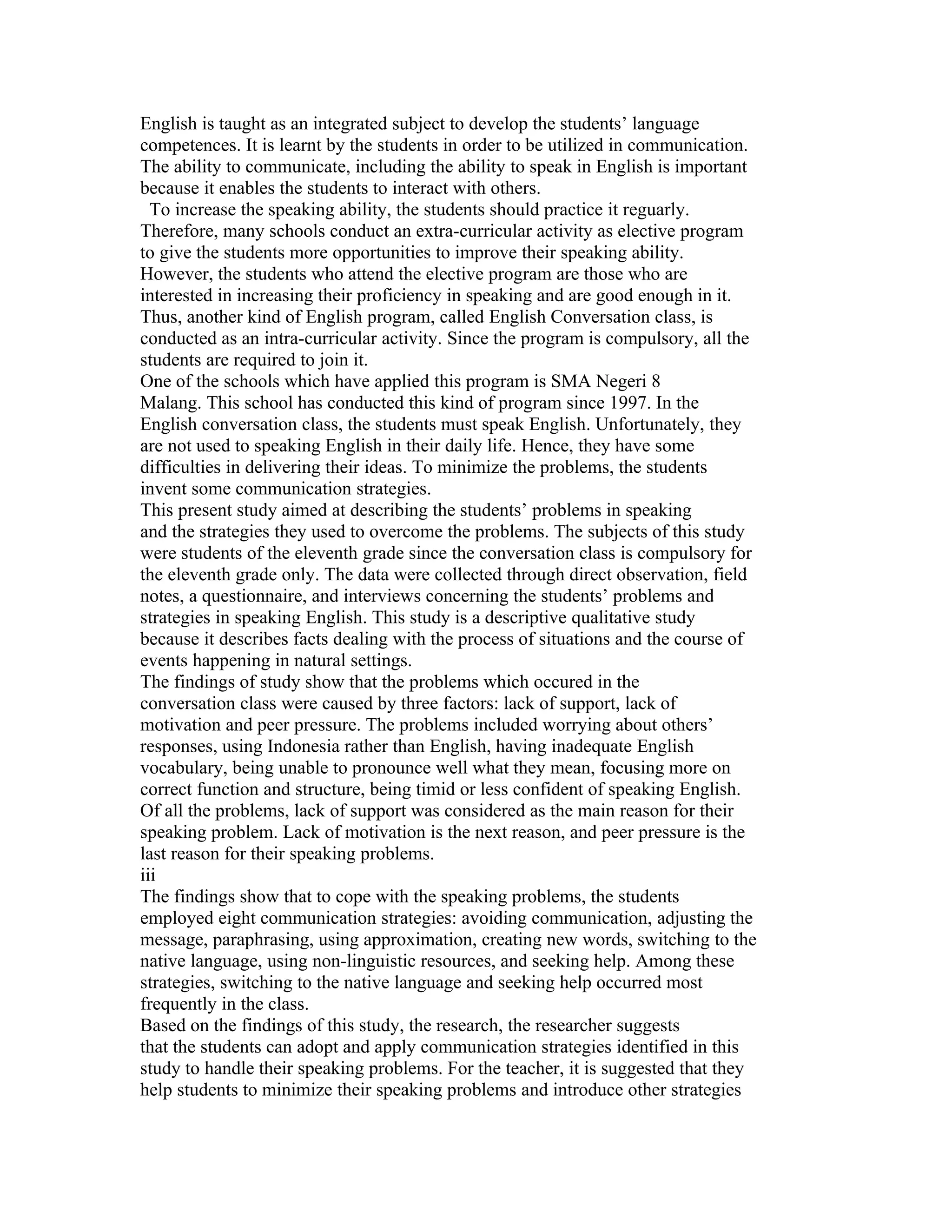 This document summarizes a study that examined the problems students face speaking English in an English Conversation class and the strategies they use to overcome these problems. The study found that students had difficulties speaking English due to a lack of support, motivation, and peer pressure. Their problems included worrying about others' responses and using their native language instead of English. To cope, students employed strategies like avoiding communication, paraphrasing, and seeking help. The most common strategies were switching to their native language and seeking help from others. The researcher suggests students adopt these strategies and teachers help minimize speaking problems and introduce new strategies.
