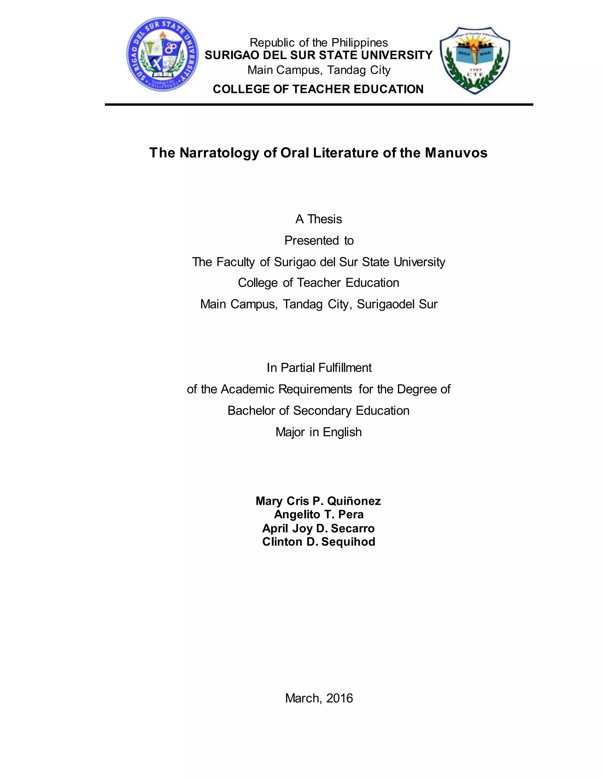 This thesis analyzes the oral literature of the Manuvo people in Siagao Island, Philippines. It identifies common folk songs, ritual songs, and stories that are still shared in the community to understand their themes, symbols, and cultural values. The study uses narratology and literary approaches like formalism and mimesis to interpret the oral traditions. It finds that the oral literature reflects the Manuvos' language, culture, and traditions, influencing their way of life. The study aims to preserve these oratures for future generations and contribute to pedagogy.