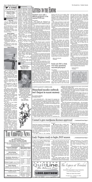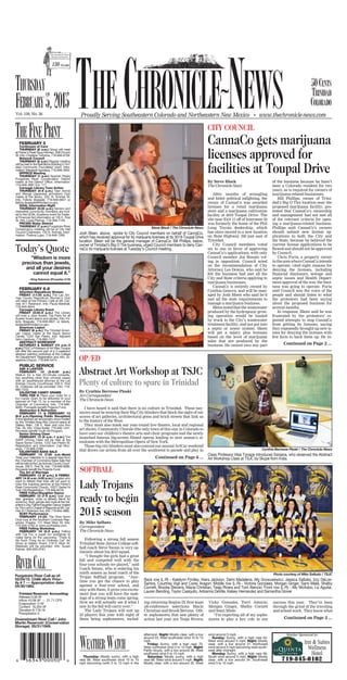 This document is a newspaper listing various community events happening from February 5-15 in and around Trinidad, Colorado. It includes meetings for organizations like the Continuum of Care and Network Council on February 5th. It also lists library and theater events, workshops on abstract art and felting, and a Valentine's Day bake sale and father-daughter dance. The document provides details on dates, times, locations and contact information for local community events in Trinidad during that period.