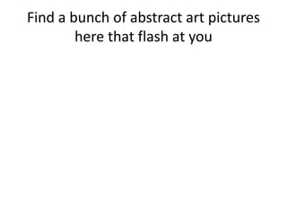 The document provides information about several abstract artists including Chuck Close, Piet Mondrian, and Wassily Kandinsky. It discusses how each artist was influenced by other movements or artists and developed their own abstract expressionist or cubist styles. It also includes examples of individual works by each artist and suggests activities and videos for replicating aspects of their styles.