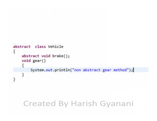 The document covers abstract classes and methods in Java, explaining their definition, purpose, and characteristics. It details why abstract classes cannot be instantiated, the distinction between abstract and concrete classes, and the rules surrounding inheritance and method implementation in these classes. Additionally, it addresses exceptions, such as the ability of abstract classes to contain final methods and constructors, and outlines key points about access specifiers for abstract methods.