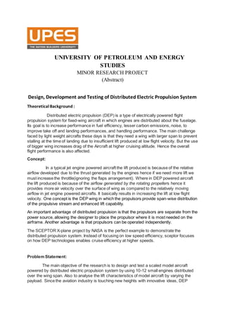 This document summarizes a research project on designing and testing a distributed electric propulsion system for aircraft. Distributed electric propulsion involves placing multiple small engines around the aircraft's fuselage and wings to improve efficiency. The project aims to design and test a scaled model aircraft powered by 10-12 small electric engines distributed along its wingspan. Testing will analyze lift characteristics at varying payloads. Distributed electric propulsion could make air travel more efficient, economical, and environmentally friendly by increasing lift and reducing emissions compared to traditional jet engines.
