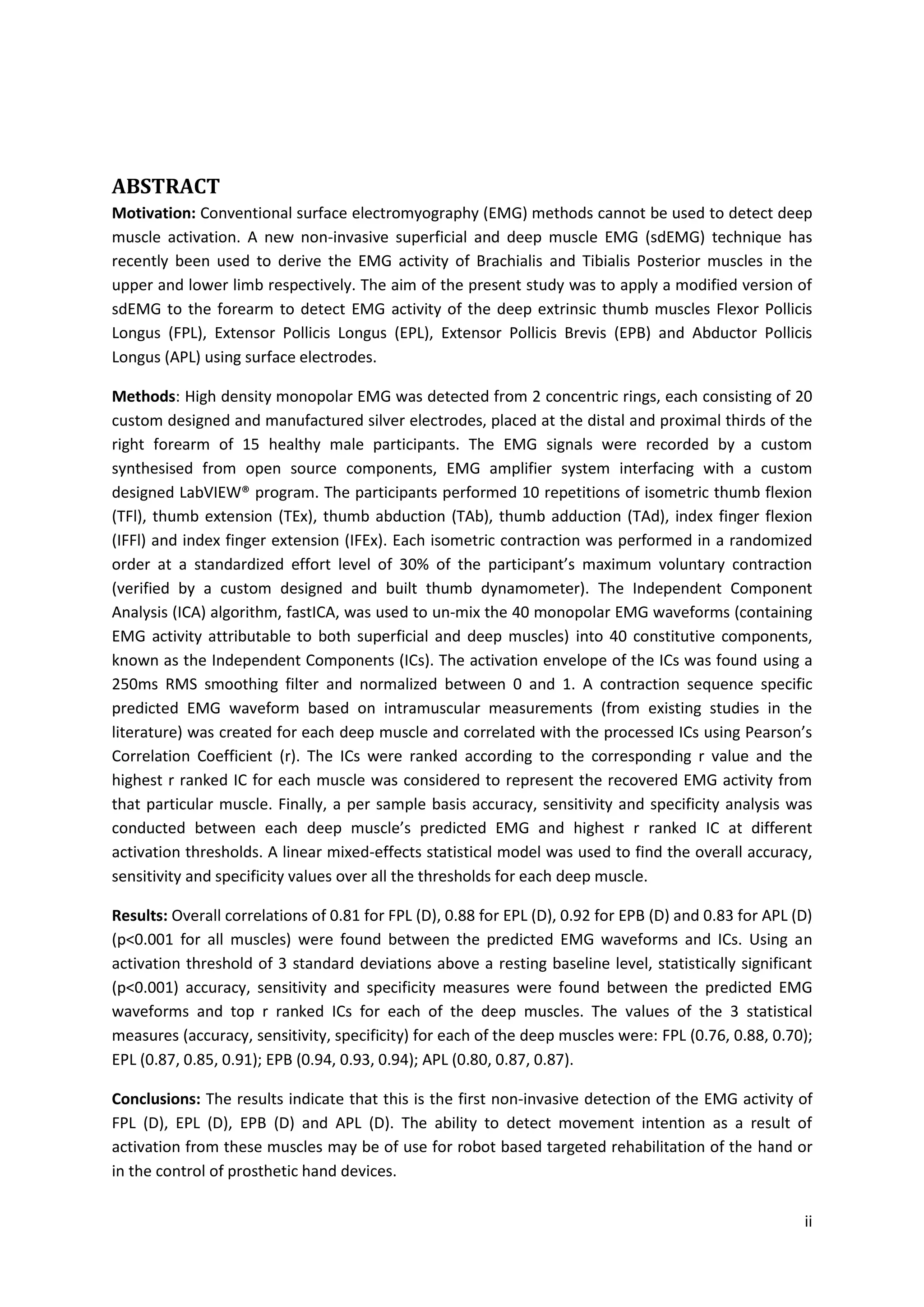 This study aimed to non-invasively detect electromyography (EMG) activity of deep thumb muscles using surface electrodes. Researchers placed electrodes on the forearms of 15 participants and recorded EMG signals while participants performed thumb movements. Independent component analysis was used to separate EMG signals from superficial and deep muscles. Predicted EMG waveforms for each deep muscle were correlated with independent components, and the highest correlated component was considered to represent that muscle's activity. Overall high correlations were found between predicted and recorded waveforms. Accuracy, sensitivity and specificity measures between predicted and recorded waveforms were also statistically significant when using a threshold activation level, demonstrating the first non-invasive detection of EMG activity from deep thumb muscles.
