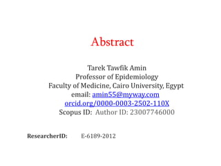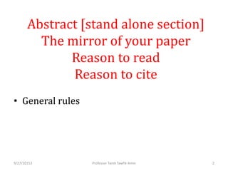 This document provides guidance on writing abstracts and keywords for research papers. It discusses including a background, methods, results, and conclusion section in the abstract. The abstract should be a short, plain paragraph that lists the core findings and main points of the paper. It should stand alone without needing the full paper for context. Technical abbreviations should be defined and references and excessive details generally avoided. Keywords should represent major concepts and be selected from an approved medical index.